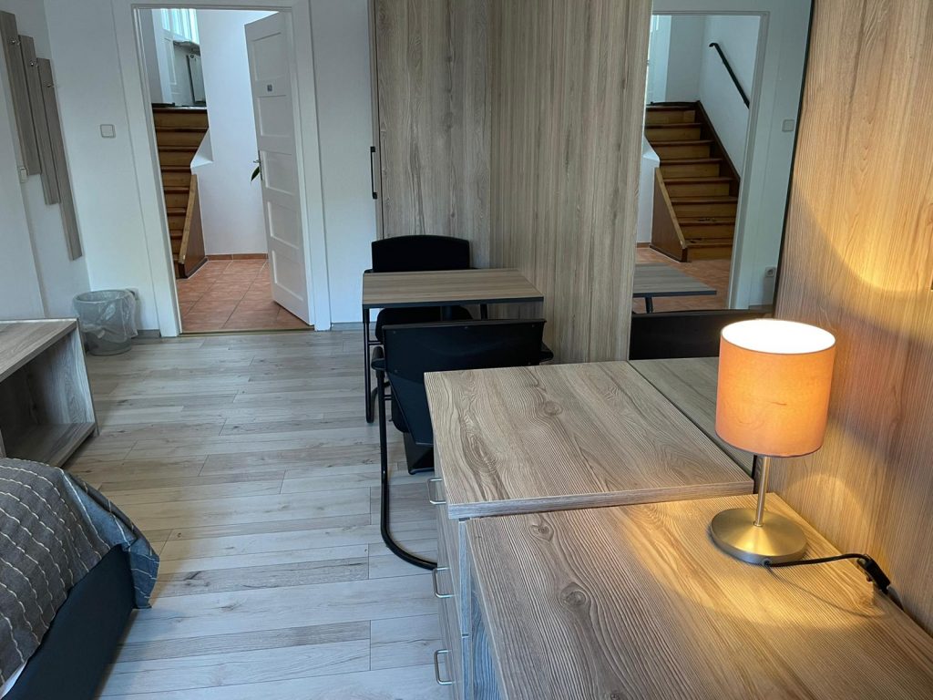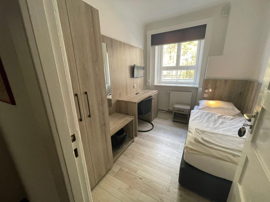 Einzelzimmer mit einem Einzelbett 90cm x200cm, Flachbild-TV, Kleiderschrank, Schreibtisch, mit eigenem Du/WC auf dem auf dem Flur , direkt neben dem Zimmer, abschließbar nur für das Zimmer, Fön, Dusch-Waschgel, 9m², Kühlschrank, elektrisches Verdunklungsstore.