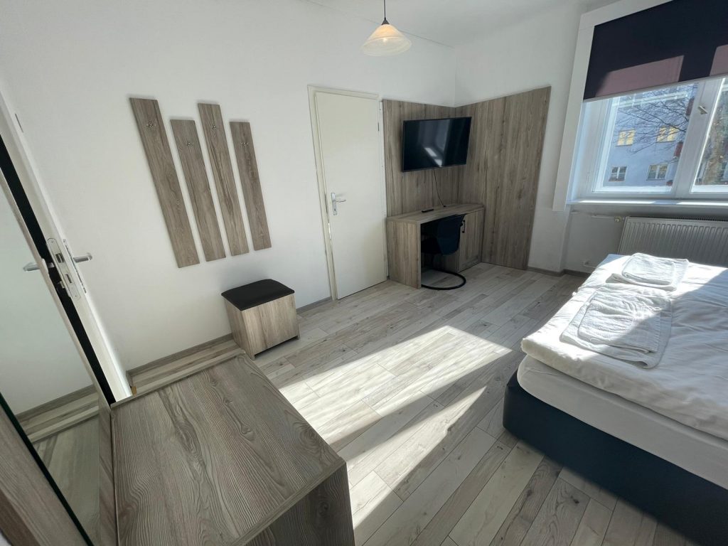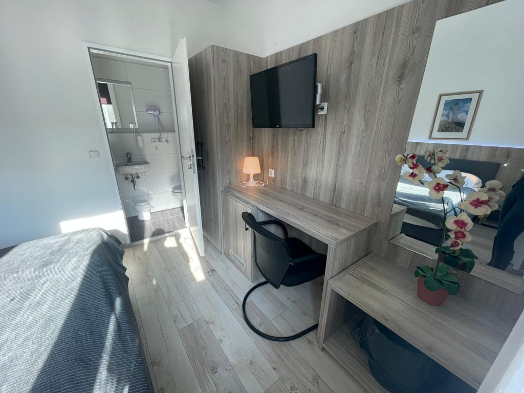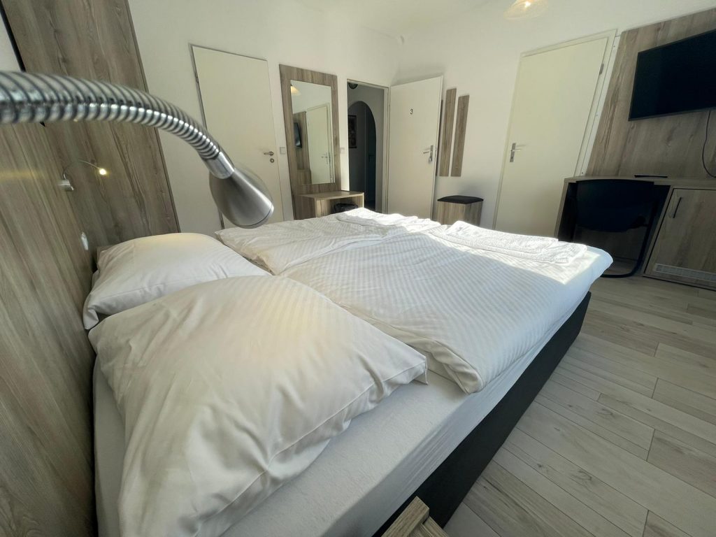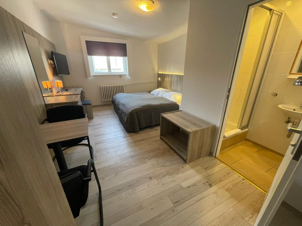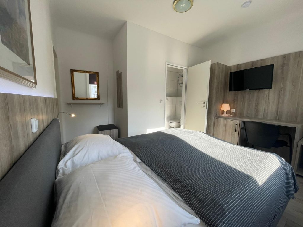 Doppelzimmer mit Flachbild-TV, mit neuem Du/WC im Zimmer, Fön, Dusch-Waschgel, 15m² mit einem Doppelbett 160cm x200cm, Schrank und Schreibtisch, Kühlschrank, elektrisches Verdunklungsstore.