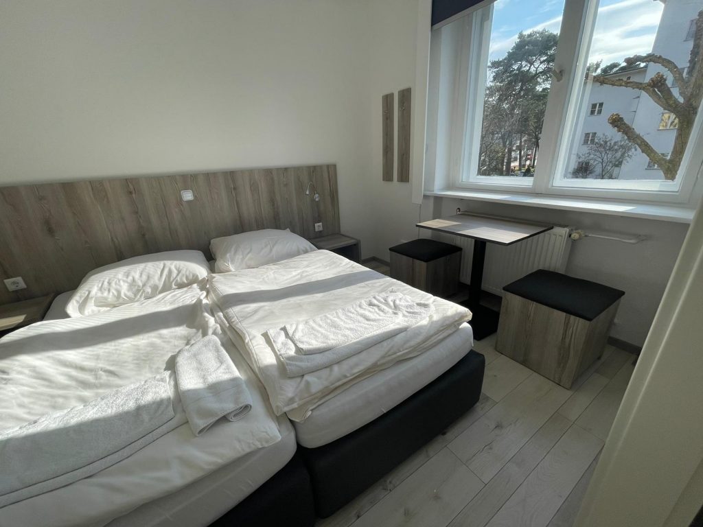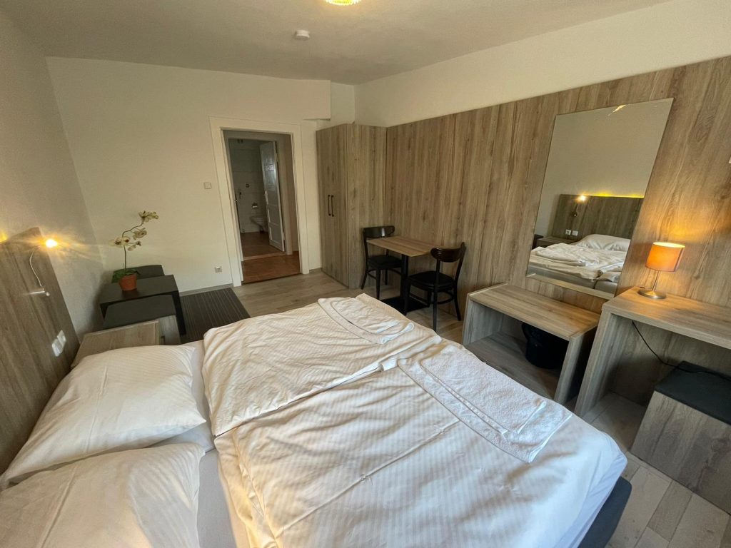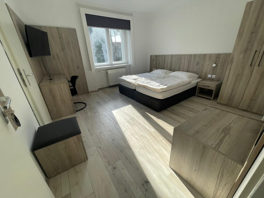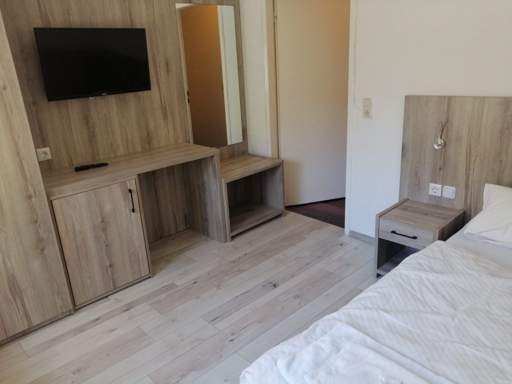 Doppelzimmer 21m², mit Flachbild-TV, mit neuem Du/WC im Zimmer, Fön, mit einem Doppelbett 180cm x200cm (mit trennbaren Betten) Kleiderschrank, Kofferablage, Schreibtisch, Kühlschrank, elektrisches Verdunklungsstore.
