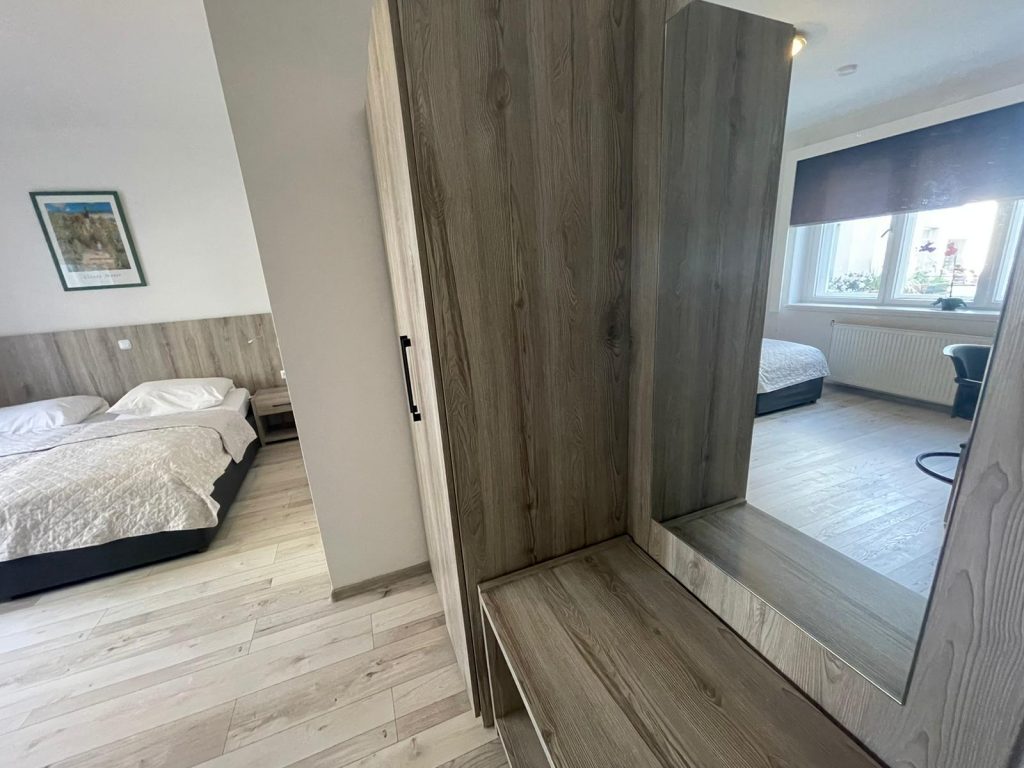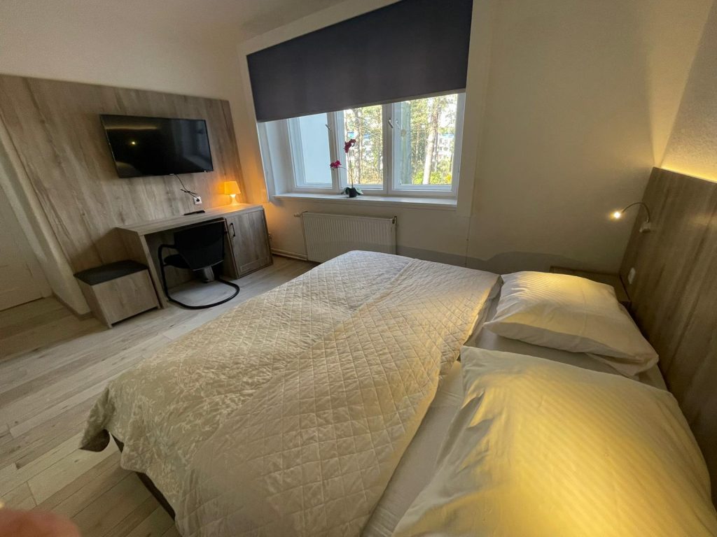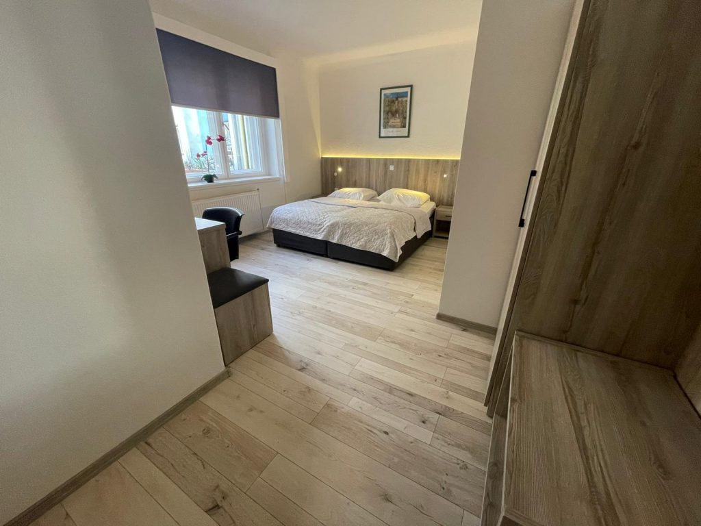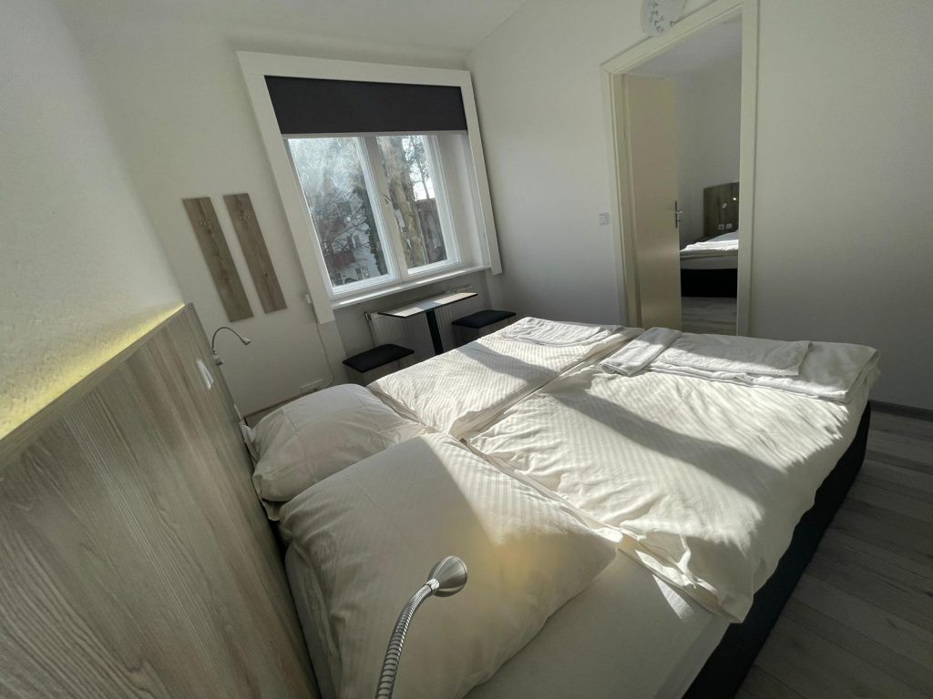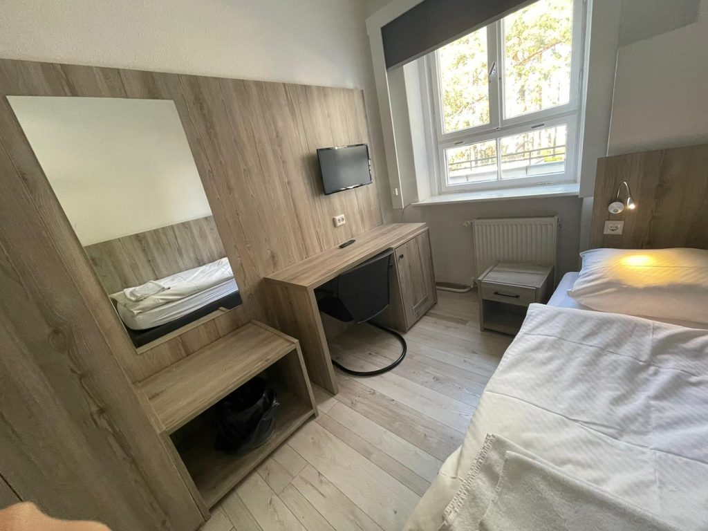 Doppelzimmer 21m², mit Flachbild-TV, mit neuem Du/WC im Zimmer, Fön, mit einem Doppelbett 180cm x200cm (mit trennbaren Betten) Kleiderschrank, Kofferablage, Schreibtisch, Kühlschrank, elektrisches Verdunklungsstore.