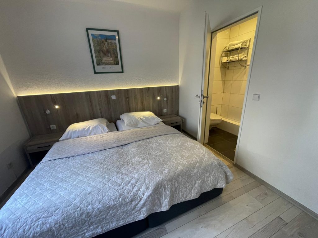 Ein Doppelzimmer 18m², Flachbild-TV und großer eigener Dusche / WC mit Fenster direkt gegenüber des Zimmers mit Zugang nur für das Zimmer, mit einem Doppelbett 180cm x200cm, mit zwei trennbaren Betten, Kleiderschrank, Kofferablage, Schreibtisch, Kühlschrank, elektrisches Verdunklungsstore.