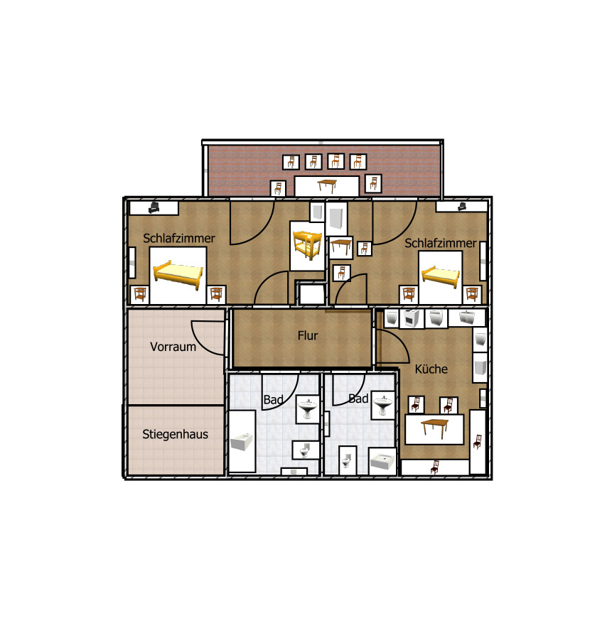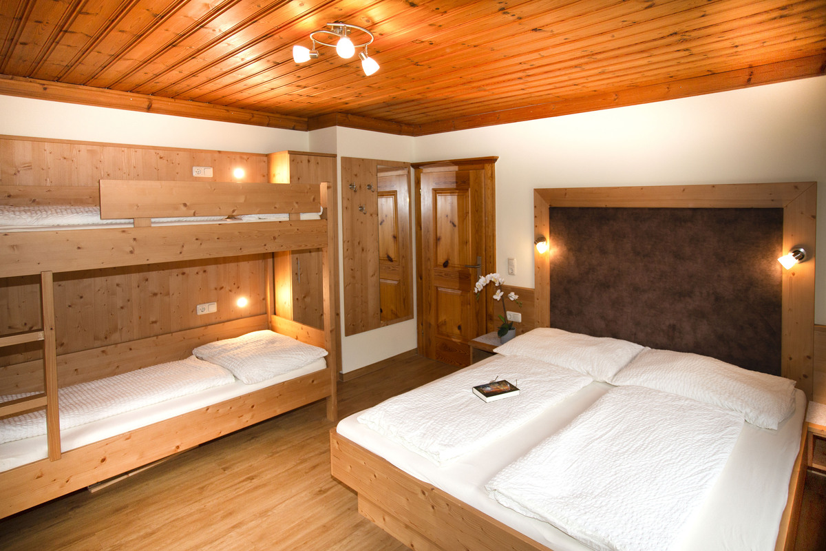 Unser Appartement Edelweiss mit Balkon-Terasse ist ausgestattet mit 2 Schlafzimmer mit je einem Doppelbett (180*200). 2 Bädern mit WC, Dusche oder Badewanne. In einem Schlafzimmer befindet sich ein Etagenbett für 2 Personen (90x200). Unsere Schlafzimmer sind mit 143cm Smart TV und gratis WLAN ausgestattet.