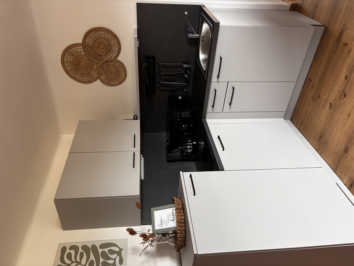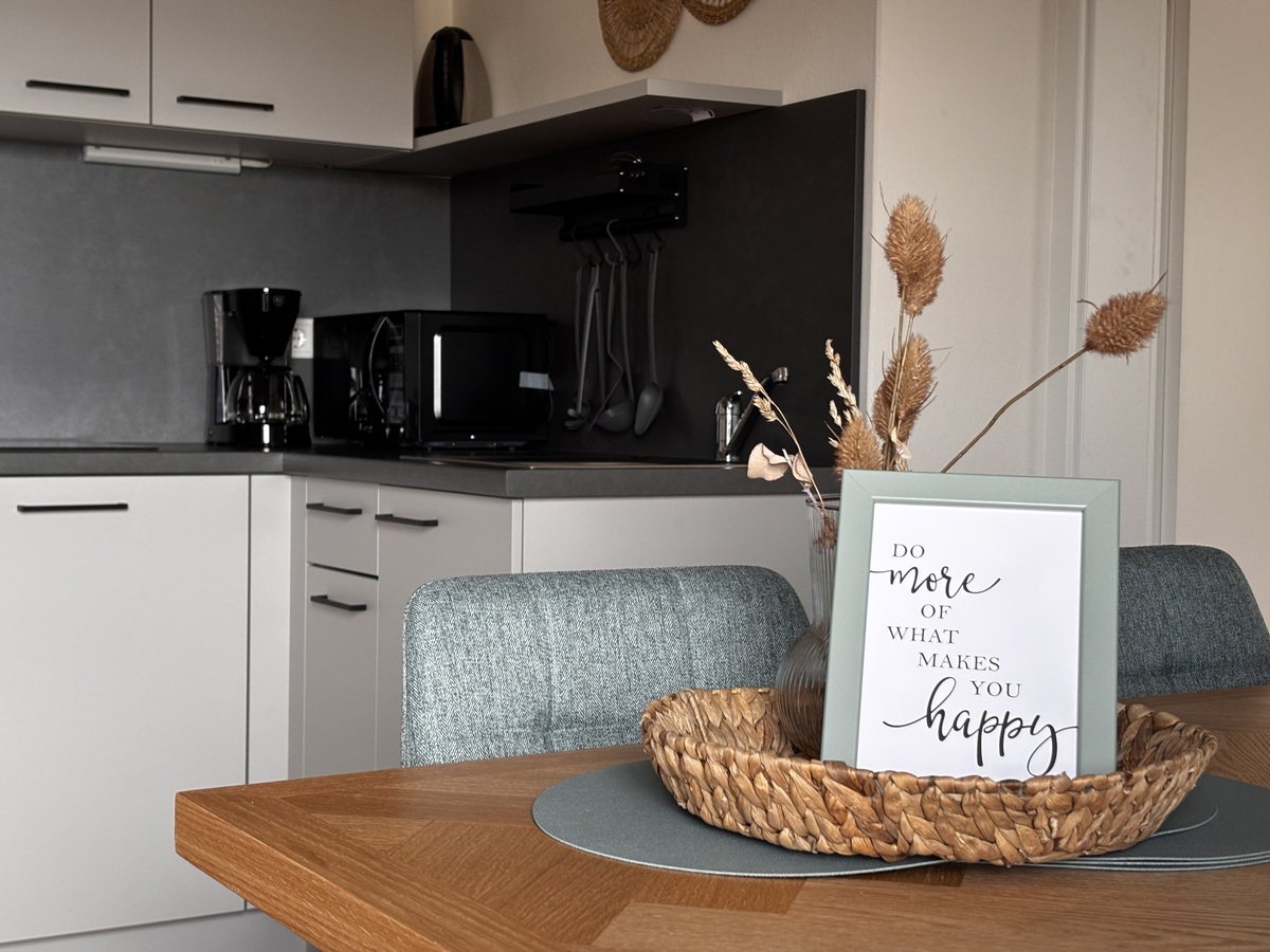 • Komplett ausgestattet KÜCHE mit Kühl-/Gefrierkombination, Cerankochfeld, Mikrowelle, Kaffeemaschine, Wasserkocher und vielen praktischen Küchenutensilien.