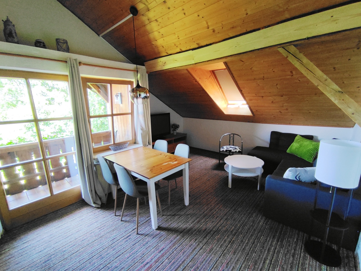 einen Wohnraum mit Esstisch, Couchecke, Kabel-TV und einem Balkon zur Wiese hin,