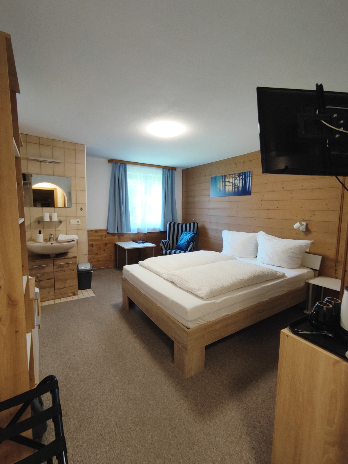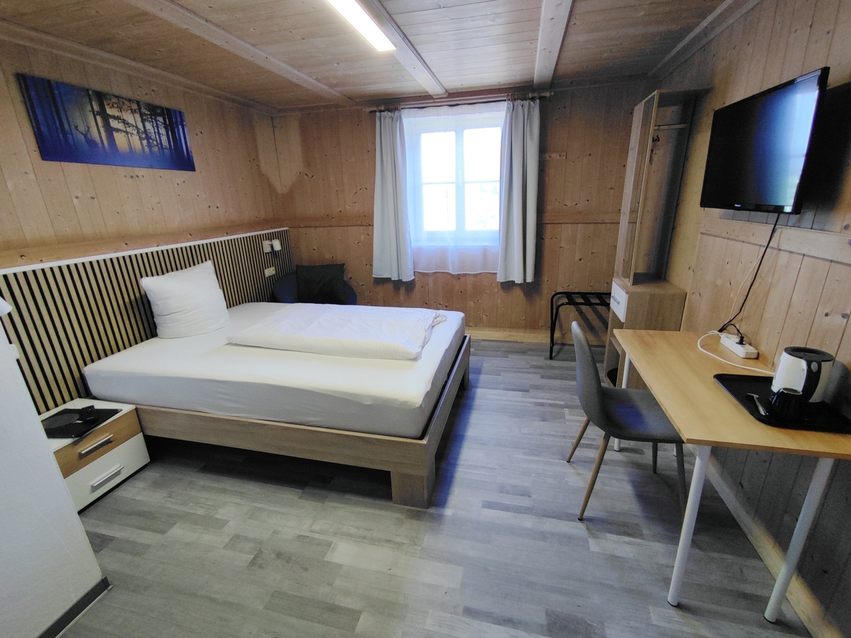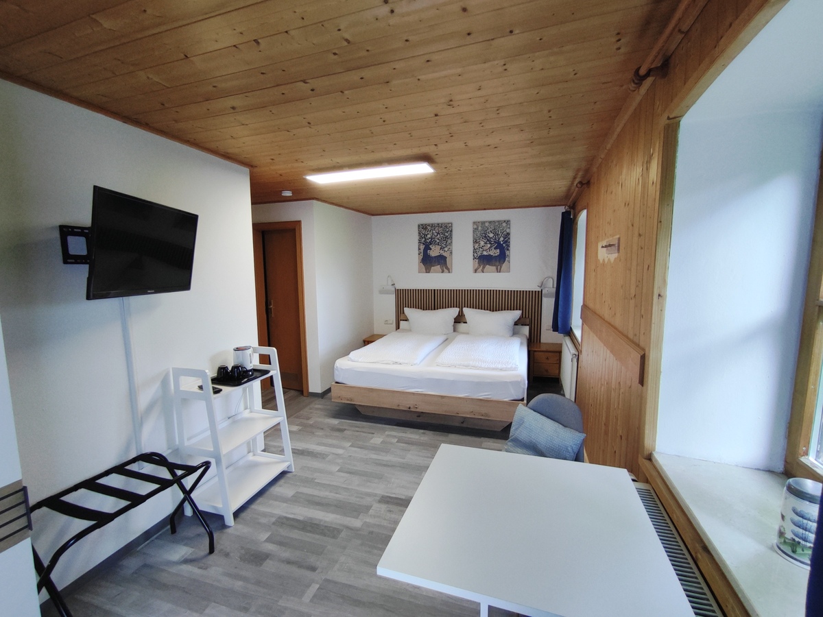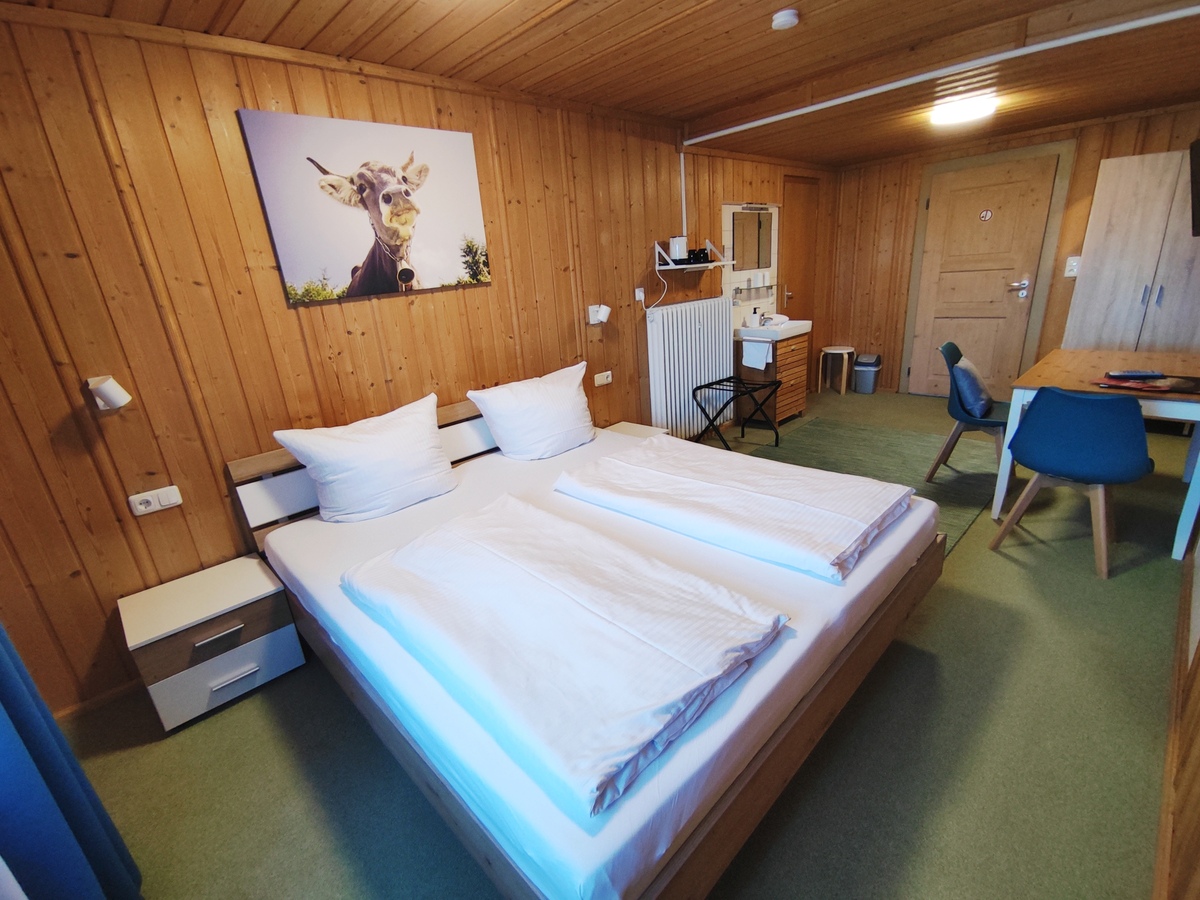 Die neu möblierten, freundlichen Doppelzimmer mit Südbalkon und Blick auf das Ammergebirge bzw den Falkensteinkamm verfügen jeweils über ein 180x200-cm-Bett mit offenem Fußende, einen Sitzbereich und ein kleines Badezimmer mit DU/WC.