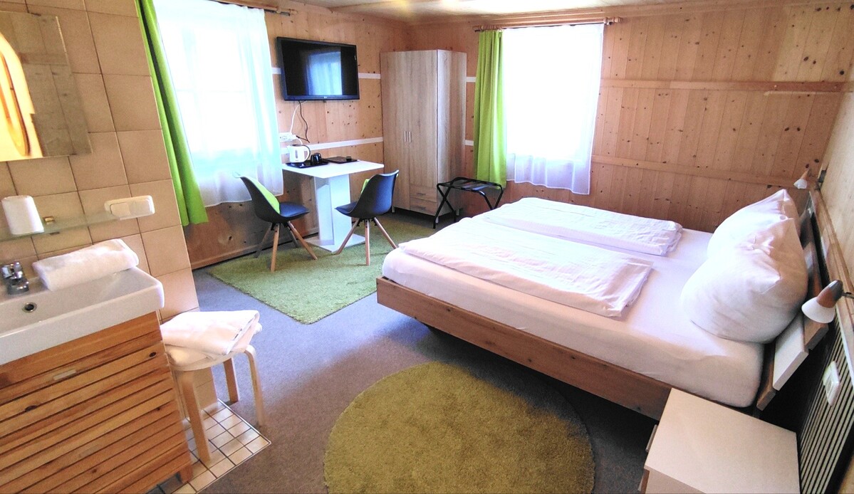 Die individuell möblierten, gemütlichen Doppelzimmer mit Fenster zum Garten/der Wiese und Bergblick, ohne Balkon, haben jeweils ein 180x200-cm-Bett mit offenem Fußende, einen Sitzbereich und einen eigenen Badbereich mit DU/WC.