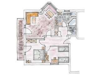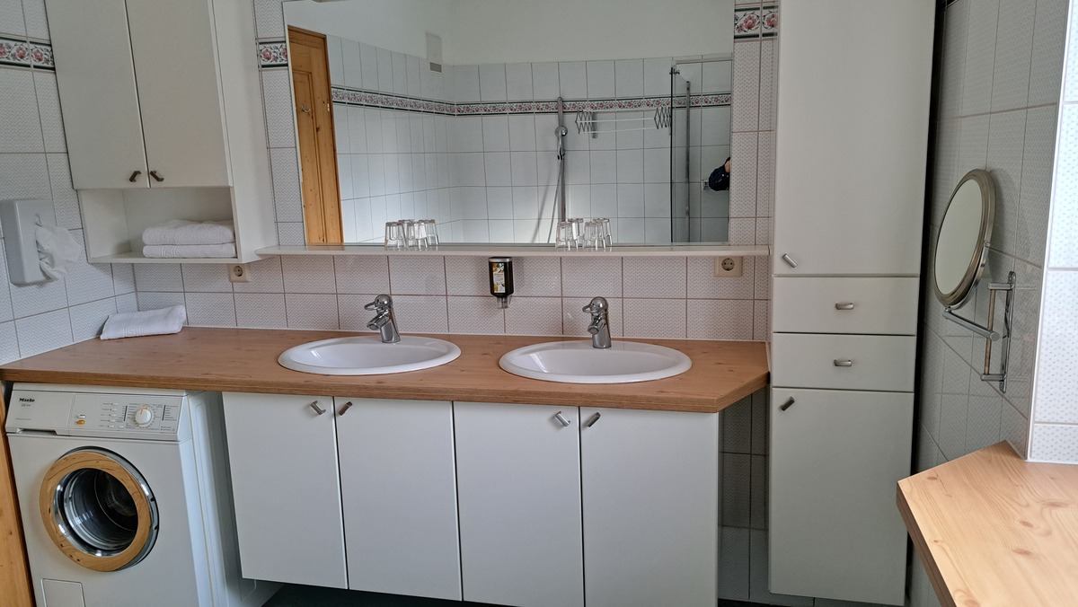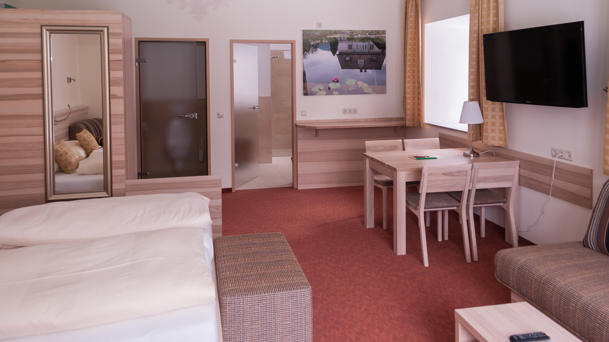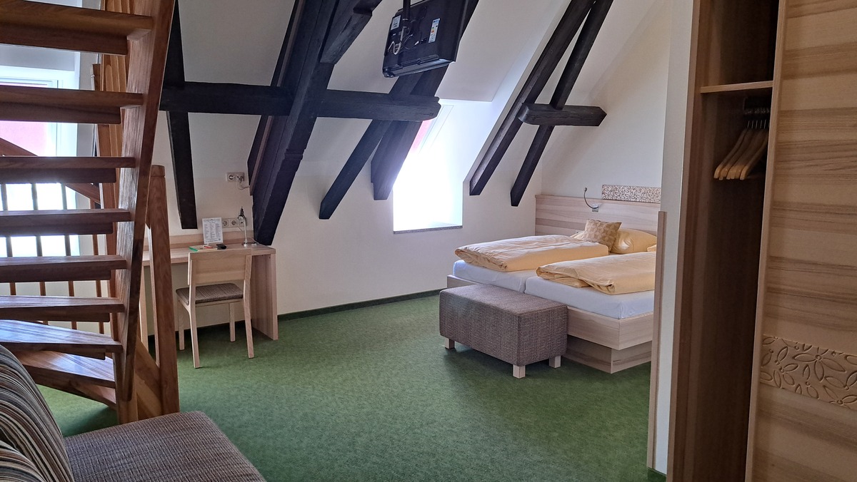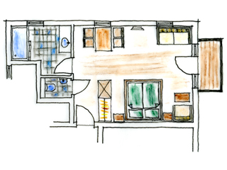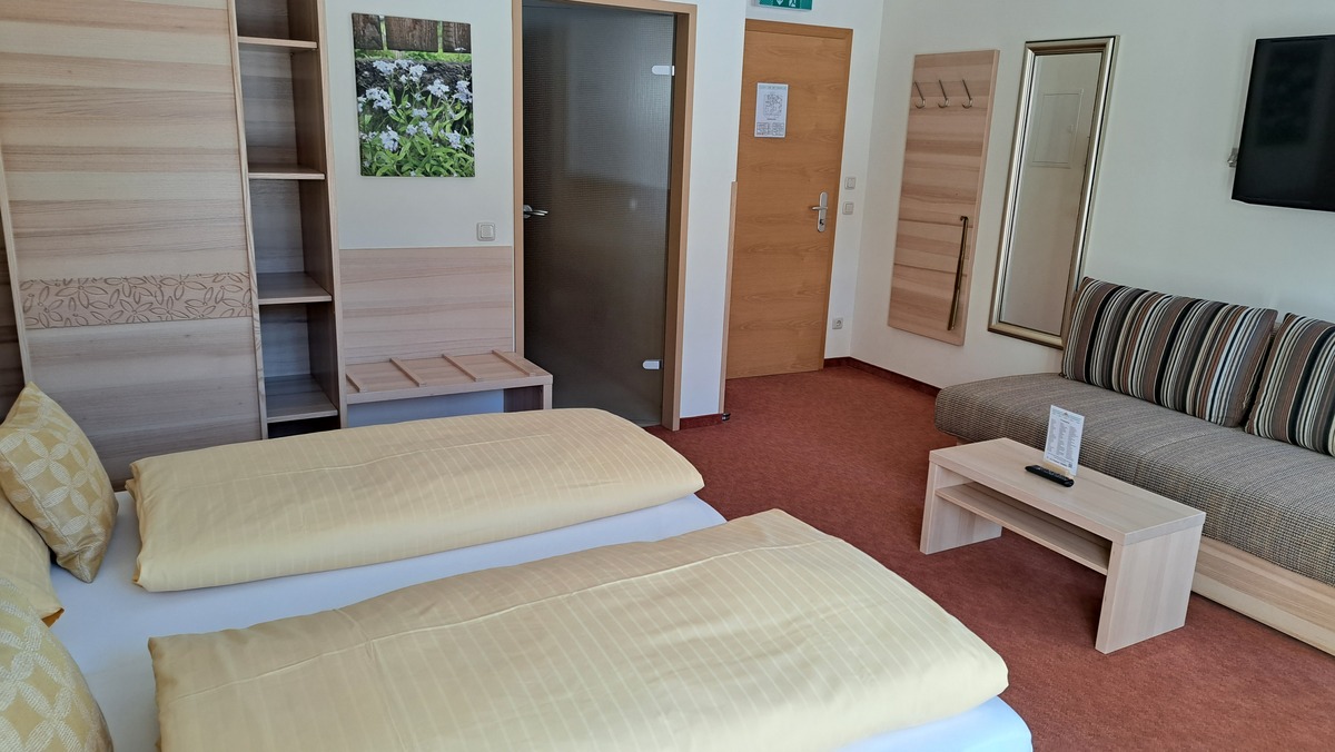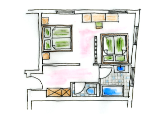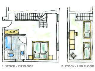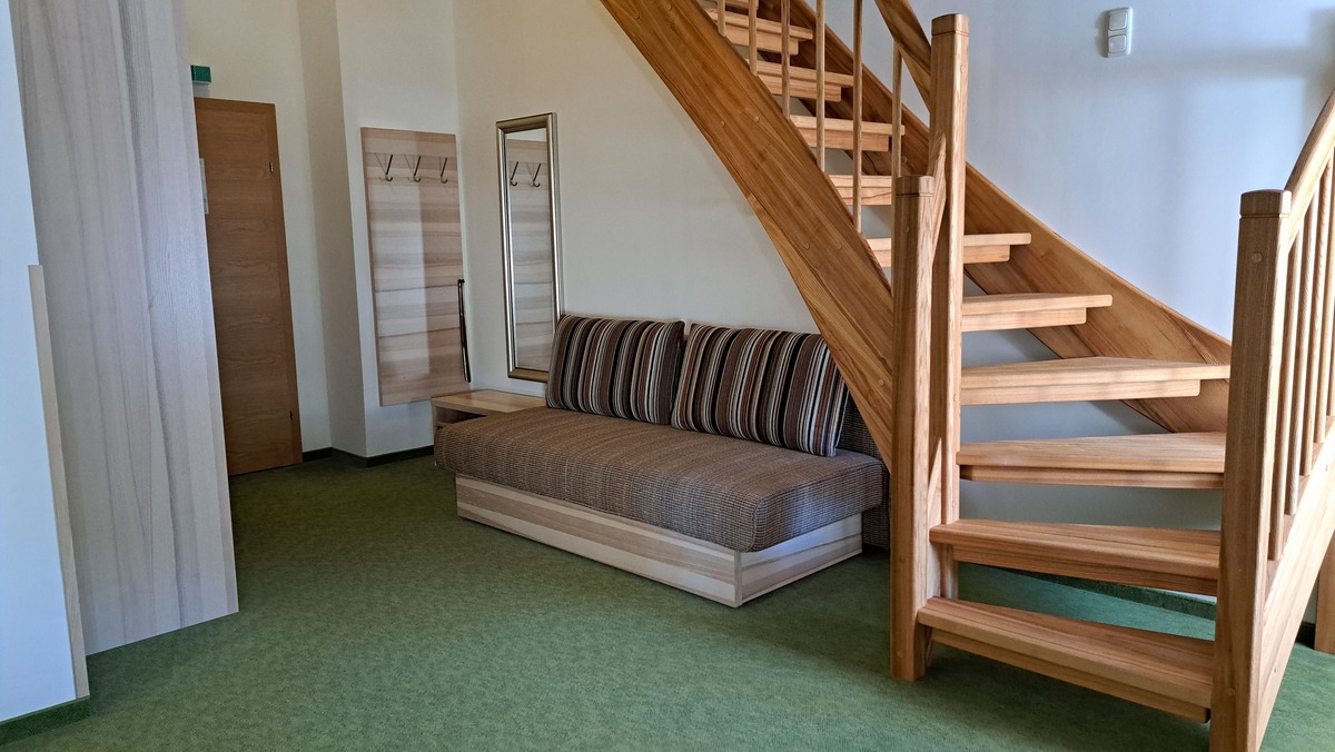 FAMILY SUITE, Spacious family-size Suite in sunny colours, noble natural wood with a living room and bed room together and a children`s bedroom with two single beds separated by the stairs , a large bathroom with shower, hairdryer, vanity mirror, free toiletries, toilet, 2 large Flat TVs, Wireless LAN, facing south with a view of the meadows and mountains. The suite is for parents with children aged 6 and over.