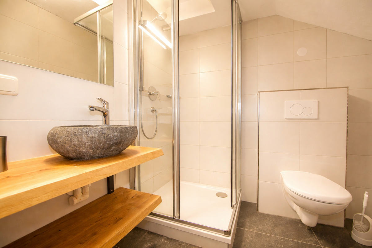 Our Liftblick apartment is located on the ground floor and features its own covered terrace of approx. 20 m². The apartment includes a bedroom with a double bed, a bathroom with shower and toilet, as well as a smart TV. In the spacious living area, you will find a comfortable sofa bed (W: 170 × L: 200 cm) with a smart TV and access to a private bathroom with shower and toilet. The sofa bed provides enough space for 2 adults or children to sleep.