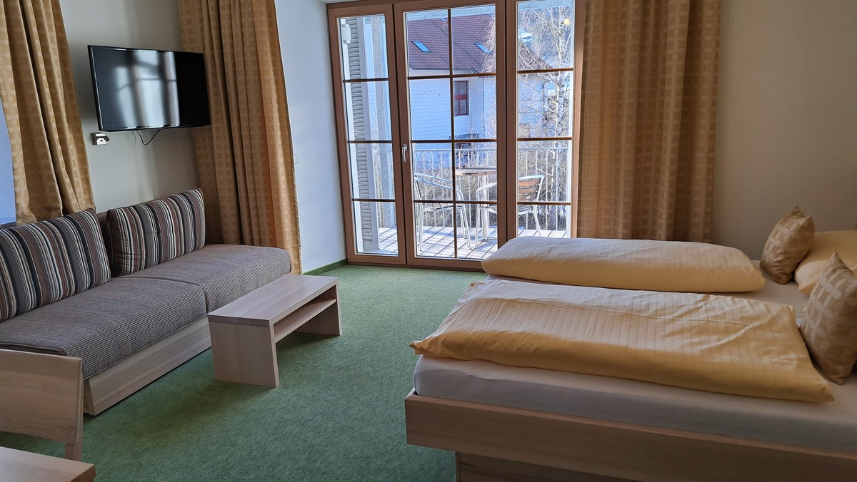 SUITE 2 SLEEPING ROOMS, Spacious family-size Suite in sunny colours, noble natural wood with a living room and bed room together and a separate children bedroom with a double bed, a balcony, a large bathroom with shower, hairdryer, vanity mirror, free toiletries, toilet, 2 large Flat TVs, Wireless LAN, facing south with a view of the meadows and mountains