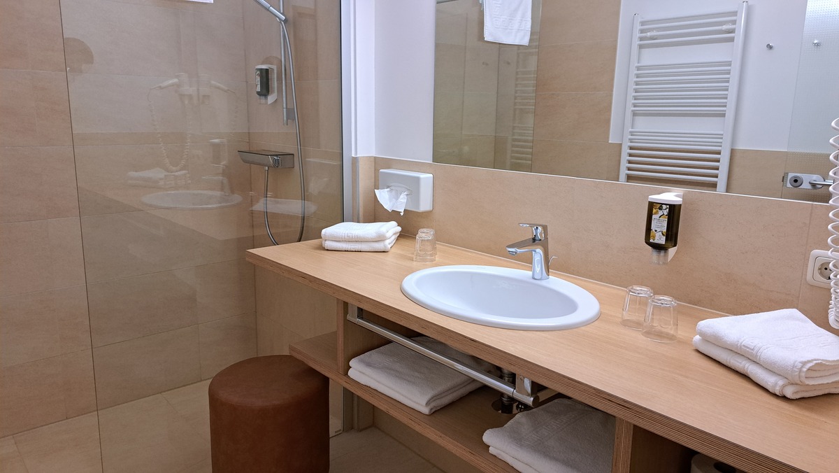 DOUBLE ROOM SUPERIOR, very bright double room superior with high class fabrics in muted colours, noble natural wood, bathroom with shower and toilette, hairdryer, vanity mirror, free toiletries, large Flat TV, Wireless LAN, facing south with a view of the meadows and mountains