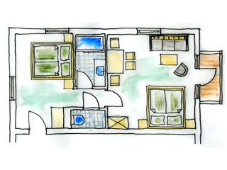 FAMILY SUITE, Spacious family-size Suite in sunny colours, noble natural wood with a living room and bed room together and a children`s bedroom with two single beds separated by the stairs , a large bathroom with shower, hairdryer, vanity mirror, free toiletries, toilet, 2 large Flat TVs, Wireless LAN, facing south with a view of the meadows and mountains. The suite is for parents with children aged 6 and over.